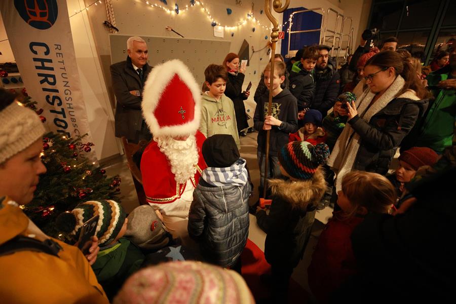 Bereits zum fünften Mal lud die Mannschaft von „Christoph 14“ Kinder, die in diesem Jahr mit dem Hubschrauber transportiert oder versorgt wurden, in den Hangar auf dem Dach des Traunsteiner Klinikums ein und präsentierte einen besondeTrotz des großen Andrangs nimmt sich der heilige Mann für jedes Kind Zeit und lässt sich ihre persönlichen Erlebnisse schildern, bevor sie mit einem kleinen Säckchen beschenkt werdenren Gast, der aus der Luft einschwebte: den Nikolaus.