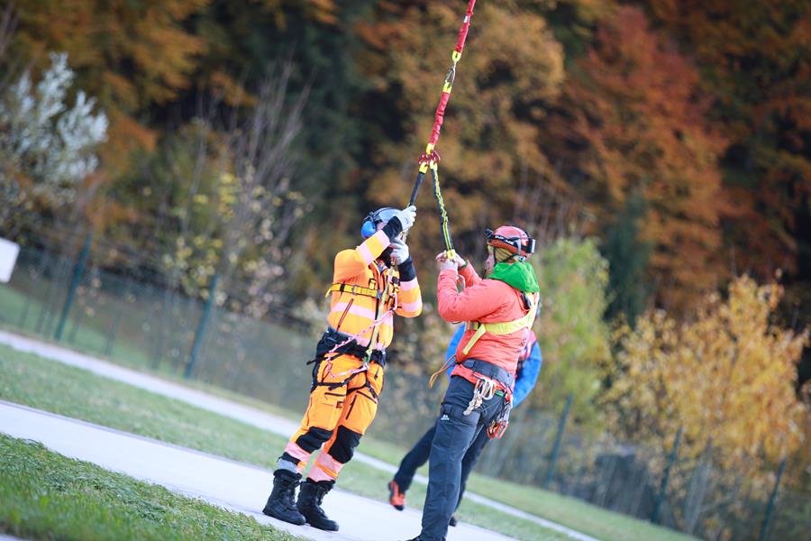 Das Anlegen des Rettungsdreiecks wurde ebenfalls mit einer "Hubschrauber gefesselt" Situation geübt. Dies bedeutet, dass der Retter im steilen Gelände gesichert ist und sich durch den Windenhaken des Hubschraubers zum aufwinchen verbindet. Diese Zeit gilt es so kurz wie möglich zu halten.