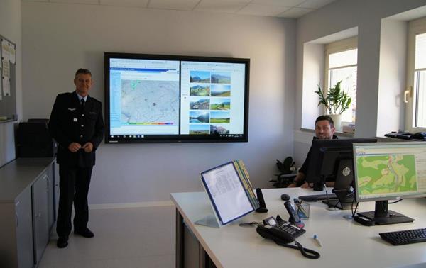 Modern und funktional sind die neuen Räume mit der Medienwand zur Flugvorbereitung, über die sich Polizeihauptkommissar Markus Pabst (links), der leitende Stationspilot Christoph 14, und Polizeihauptkommissar Andreas Weber, der diensthabende Einsatzpilot, freuen. (Foto: Mix)