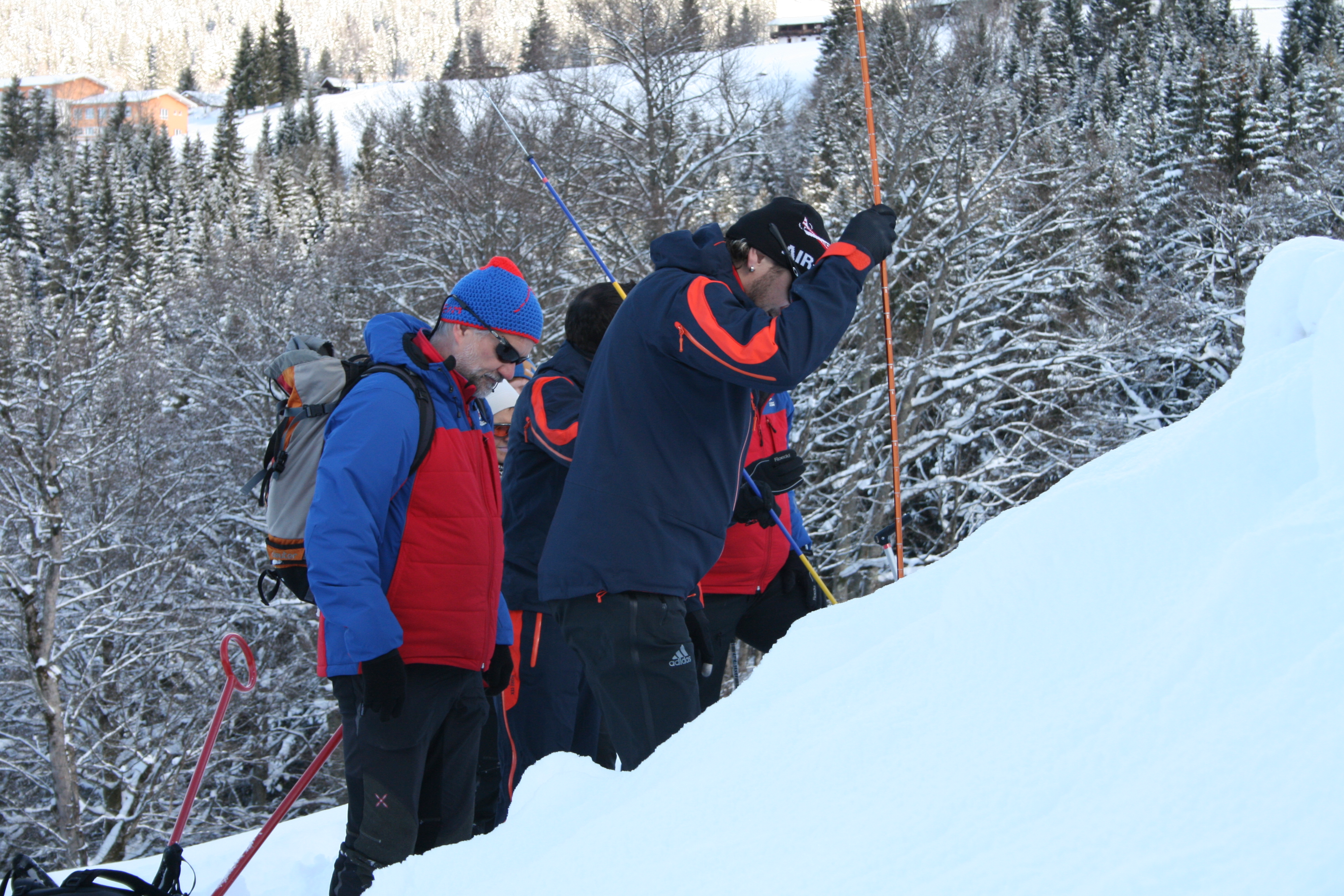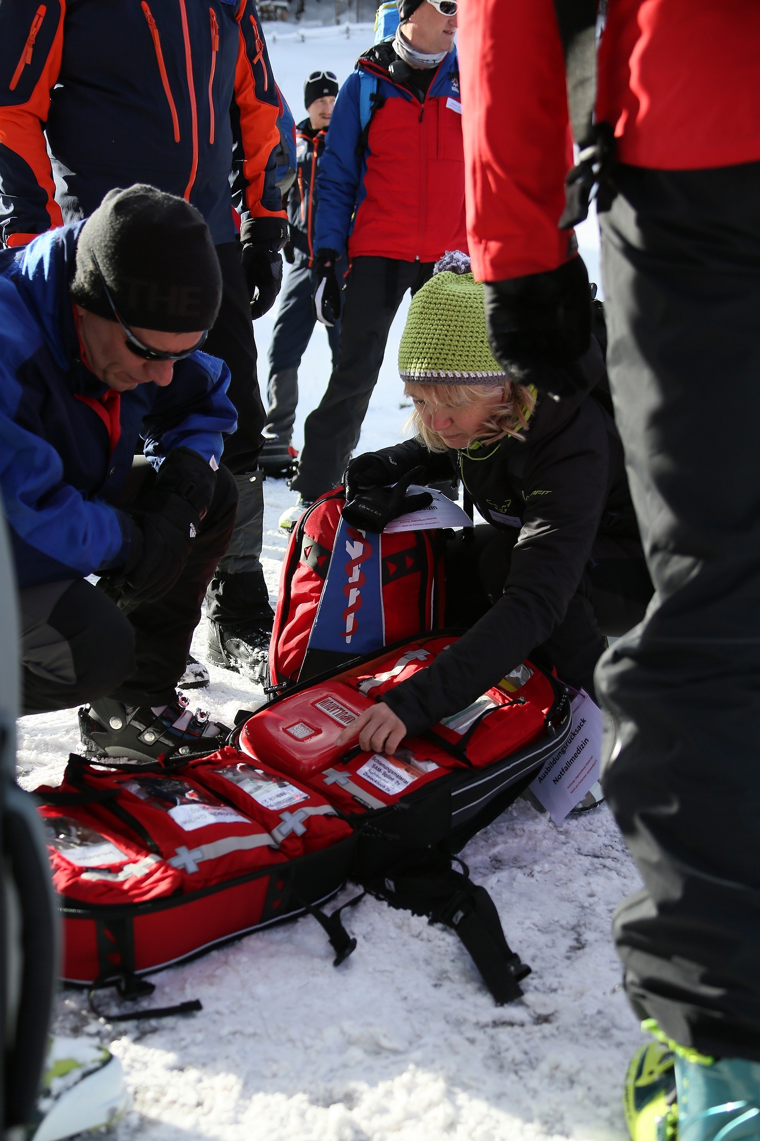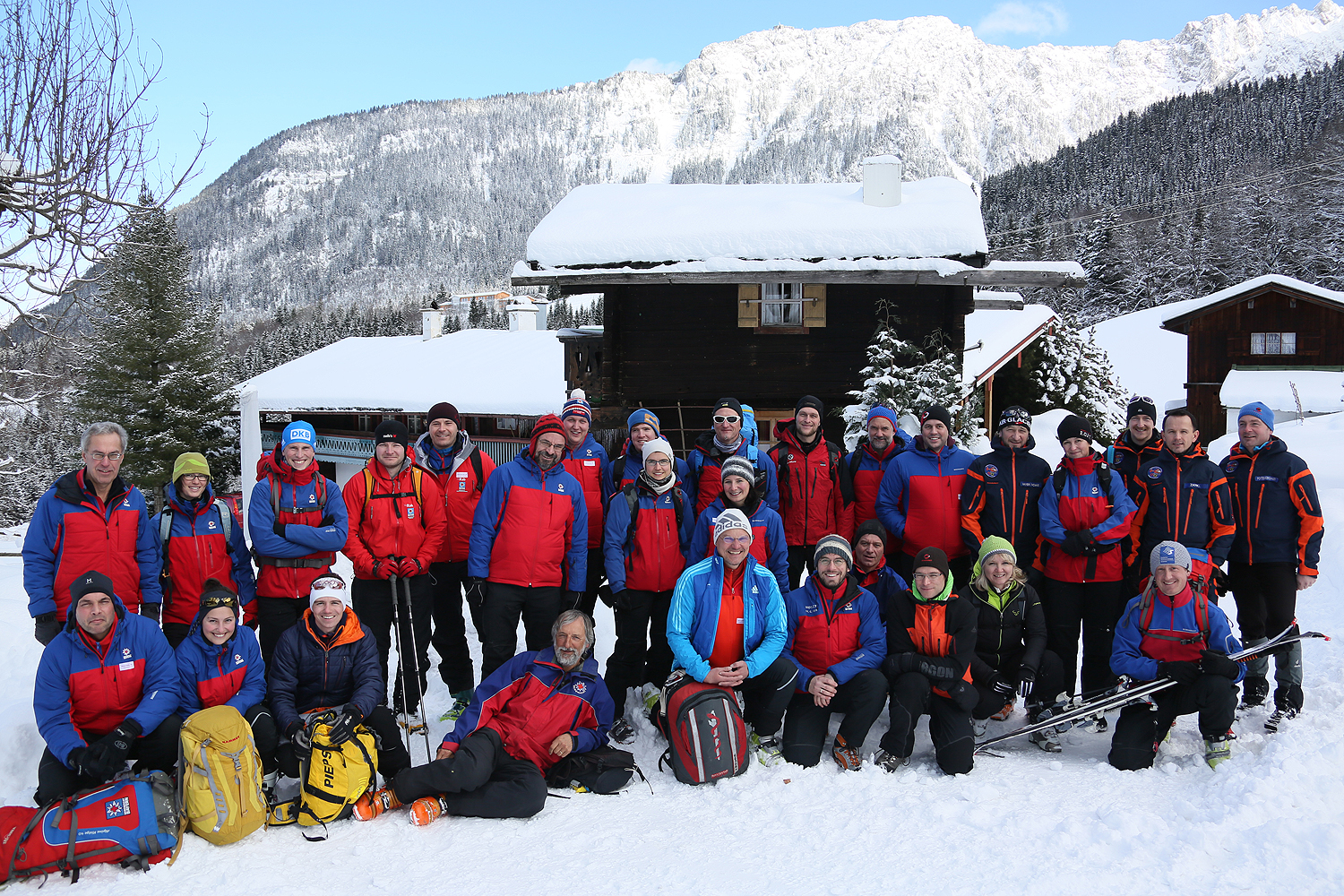 Gemäß der Idee, dass die zusammen trainieren sollen, die auch im Einsatz immer wieder zusammenzuarbeiten, brachte der Netzwerker Dr. Freund die Notfallmediziner der Bergwacht-Region Chiemgau, des Österreichischen Bergrettungsdienstes (ÖBRD) und der Hubschrauber-Stationen aus Traunstein und Salzburg zusammen. Zu Beginn stellt der ÖBRD-Bundesarzt Dr. Matthias Haselbacher die Struktur und Ausbildung der österreichischen Bergretter vor. Wesentlicher Unterschied zu Bayern ist das dichte Netz an Luftrettungsstationen, weshalb in Österreich die Bergrettung in der Regel nur nachts oder bei fehlenden Sichtflugbedingungen ausrückt. Im Verhältnis zu Bayern stehen in Österreich aktuell nur relativ wenig alpin ausgebildete Notfallmediziner für bodengebundene Einsätze zur Verfügung; der Notarzt kommt in der Regel mit dem Hubschrauber. Dr. Johannes Schiffer, der als Vertreter der Bergwacht Bayern in der Medizinischen Kommission der Internationalen Kommission für alpines Rettungswesen (IKAR) sitzt, berichtete von der letzten Tagung, die im Oktober in Nevada stattfand. Schwerpunkte waren Großschadensereignisse und Großeinsätze, wobei unter anderem der Ausbruch des Vulkans Ontake in Japan, größere Lawinenunglücke und die Höhlenrettung im Untersberg besprochen wurden. Mit den ebenfalls anwesenden Ärztlichen Leitern Rettungsdienst (ÄLRD) des Rettungszweckverbandes Traunstein wurden anschließend Szenarien auf die Chiemgauer und Berchtesgadener Berge umgelegt und diskutiert. Die Ärzte und Sanitäter befassten sich intensiv mit der richtigen Erstversorgung auf der Lawine, mechanischen Reanimationshilfen und der Entscheidung für die richtige Zielklinik.