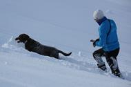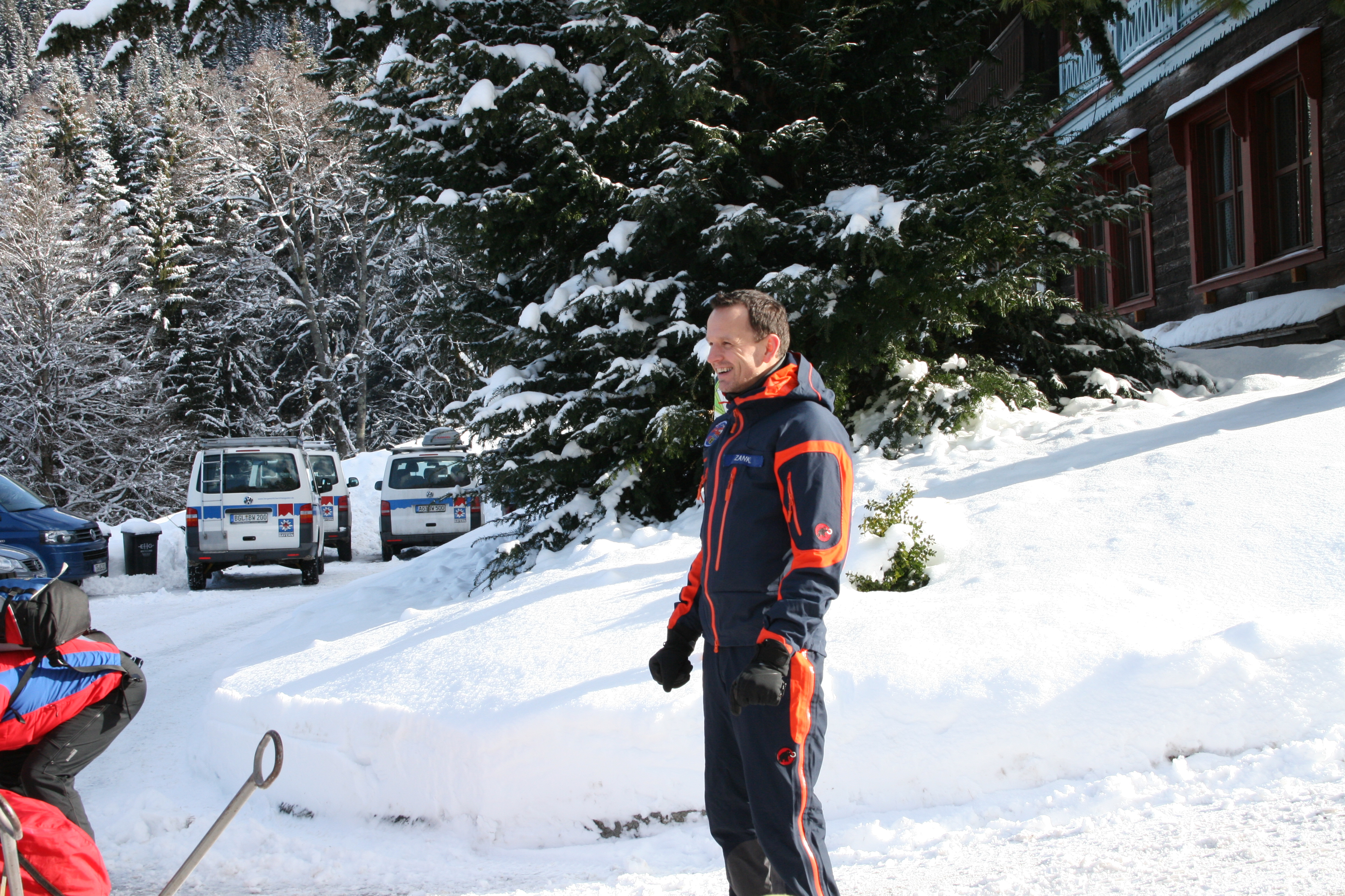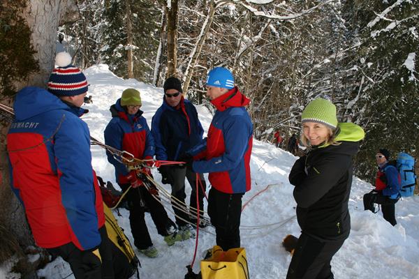 Im Anschluss ging es ins Gelände: Intensiv-Fachkrankenpfleger und Bergwachtmann Florian Kronawitter hatte im frischen Neuschneehang drei funkgesteuerte Simulations-Puppen der Kliniken Südostbayern AG platziert, an denen sehr realitätsnah Einsatzszenarien mit allen notfallmedizinischen Maßnahmen durchgespielt und geübt wurden: Zwei schwer verletzte, unterkühlte Skifahrer liegen im Hang, ein weiterer ist verschüttet und muss erst geortet und ausgegraben werden. Ralf Kaukewitsch und seine Lawinenhündin Lilly zeigten den weniger Erfahrenen, wie die Suche und Ortung mit dem LVS-Gerät funktioniert. Parallel übten die Bergwachtmänner Chris Steube, Stephan Bauhofer und Barthi Wurm mit den gemischten Teams aus Bergwacht und Hubschrauber-Besatzungen die Rettung eines abgestürzten Schlittenfahrers mit Seilzug und Akja aus dem Weidbachgraben zwischen Gollhäusl und Jenner-Mittelstation. „Es war beeindruckend, wie rasch die Teilnehmer sich als Team eingespielt hatten und Hand in Hand zusammenwirkten. Trotz kleiner Unterschiede machen doch alle dasselbe und wissen, was zu tun ist“, freut sich Dr. Freund.