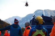 Bergwacht-Notärzte, -Sanitäter und Hubschrauber-Besatzungen üben in gemischten Teams die Rettung von Lawinenopfern und verletzten Wintersportlern