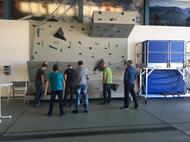 Im Übungsraum wurde nun auf einigen Stationen der Doppelwinch mit Einsatzgepäck der Bergwacht trainiert. Des weiteren mussten sich die Bergretter in einem Seilgeländer sichern und einen im Steilhang liegenden Dummy in den Luftrettungssack verpacken.
